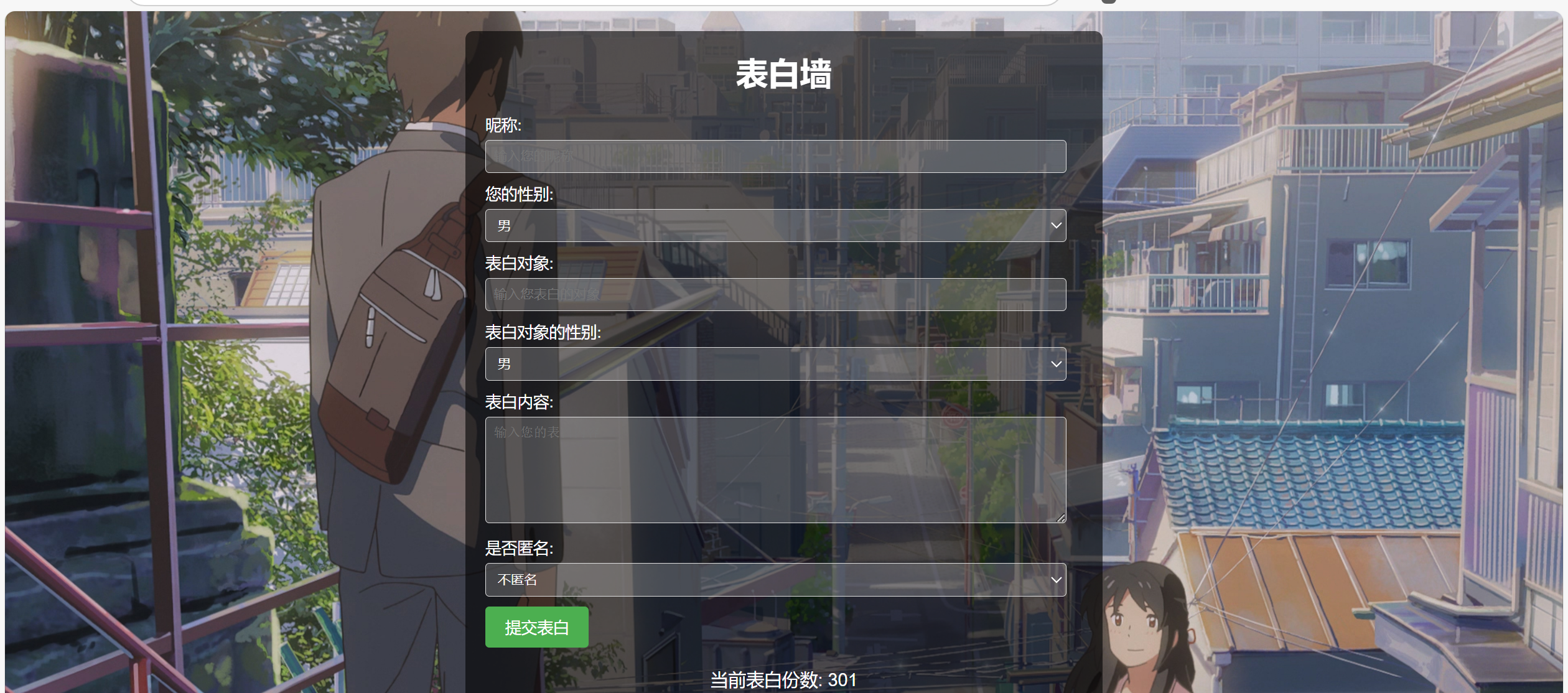 这题的机制是,你需要填写图中的表单,提交表白,要达到300次就给你flag,但是当第一次提交后第二次再交会显示:你已提交过表白,请勿重复提交;原因在于:当服务器发送你的表单之后,会在localstorage留下confessionSubmitted标签,且值为True,那实际上,我们写脚本本身就可以绕开这个机制,即使内容重复也没有关系,所以直接写个脚本就行