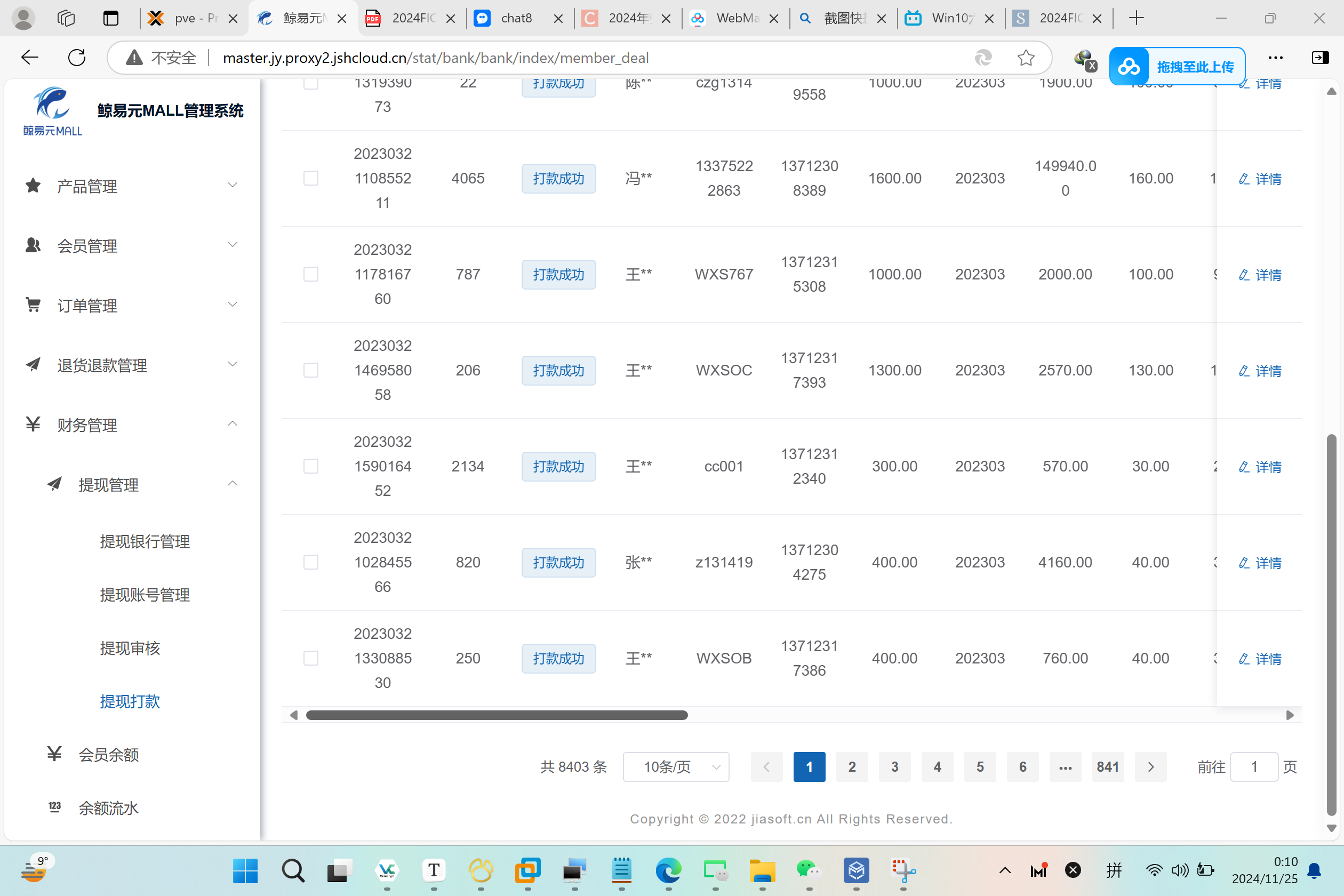 23、“鲸易元MALL管理系统”管理后台中,打款成功的提现记录数量为?【答案格式:123】